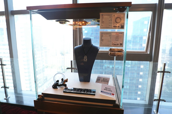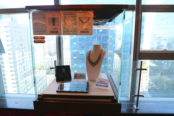會(huì)場(chǎng)展示的符合國(guó)家標(biāo)準(zhǔn)要求的NGTC珠寶鑒定證書、價(jià)簽、標(biāo)準(zhǔn)比色石及天然翡翠首飾