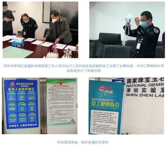 為全面貫徹黨中央、國(guó)務(wù)院抗擊新冠肺炎疫情的指示精神,貫徹落實(shí)自然資源部珠寶玉石首飾管理中心和廣東省深圳市有關(guān)決策部署,NGTC深圳實(shí)驗(yàn)室及時(shí)成立疫情防控工作小組,制定各項(xiàng)疫情防控措施和應(yīng)急預(yù)案,一手抓疫情防控工作,一手抓經(jīng)營(yíng)生產(chǎn)。在全員參與并堅(jiān)決打贏疫情阻擊戰(zhàn)的總要求下,努力為珠寶企業(yè)復(fù)工復(fù)產(chǎn)做好檢測(cè)服務(wù)工作。