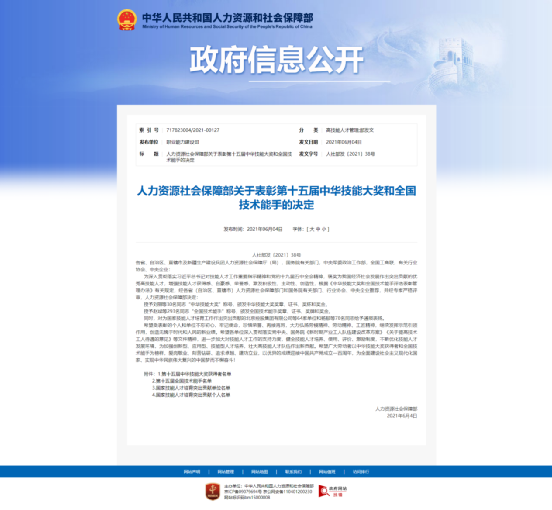 《人力資源社會(huì)保障部關(guān)于表彰第十五屆中華技能大獎(jiǎng)和全國(guó)技術(shù)能手的決定》