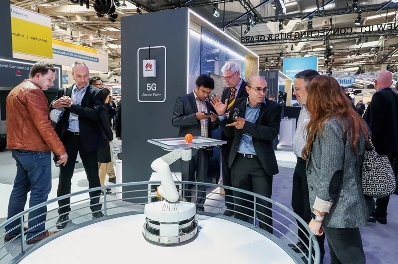 圖為2018年4月24日,在德國漢諾威工業(yè)博覽會上,參觀者在華為公司展區(qū)觀看運用第五代移動通信技術(shù)(5G)操控的機器人。新華社記者 單宇琦/攝