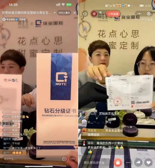 周生生金牌主播大微在直播過(guò)程中展示了配備珠寶國(guó)檢鑒定證書(shū)的鉆石首飾,令直播間網(wǎng)友消費(fèi)更有保障。