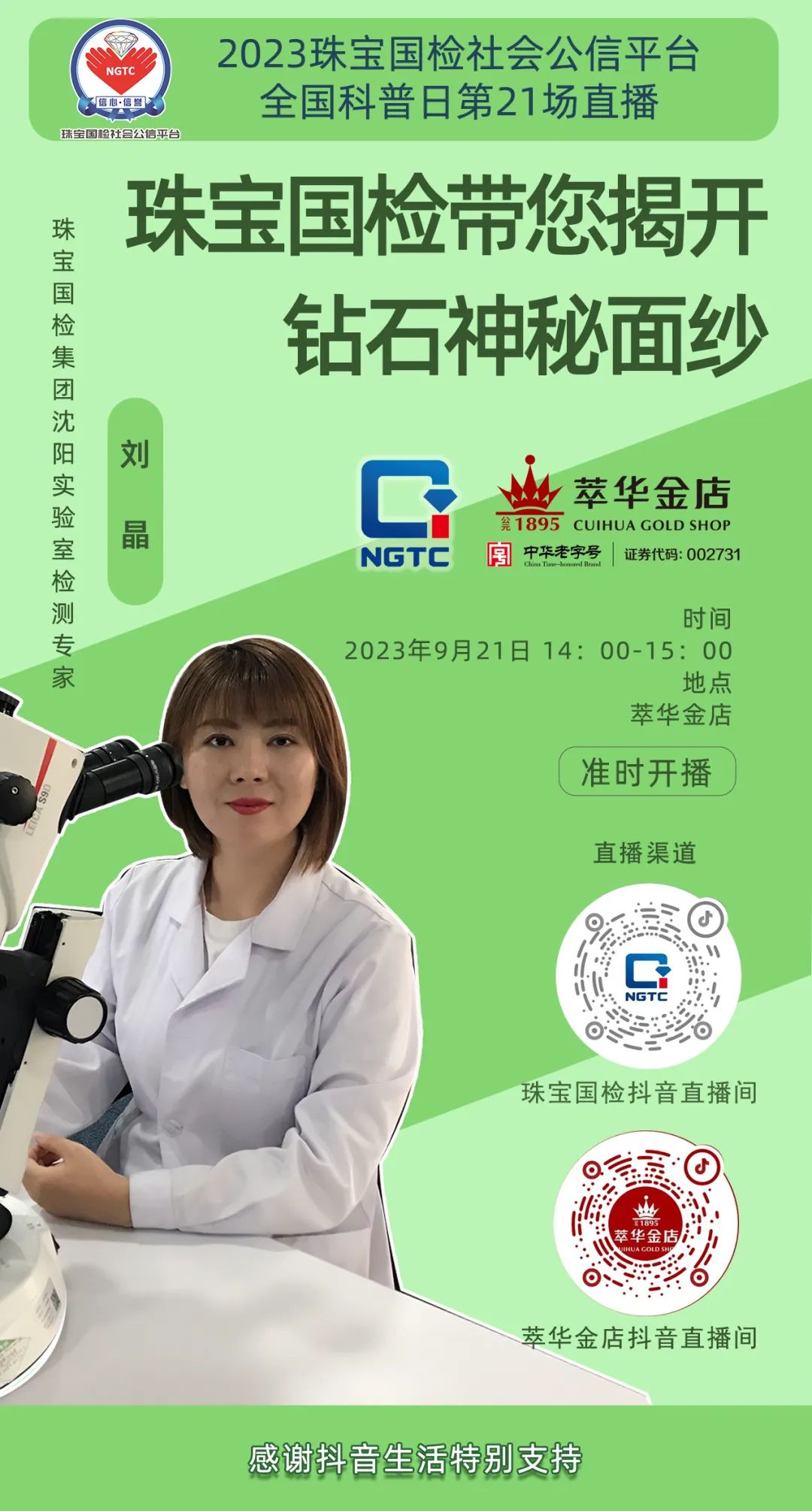 時(shí)間:9月21日14:00-15:00 地點(diǎn):萃華金店 出鏡專(zhuān)家:劉晶 直播間:萃華金店抖音直播間 珠寶國(guó)檢抖音直播間