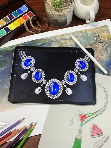 如果說傳統(tǒng)一筆一劃的手繪適用于高定珠寶的設(shè)計(jì)展示,那么iPad(平板電腦,下同)板繪就是一種令珠寶設(shè)計(jì)變得更加高效便捷的創(chuàng)作方式,它可以最大限度保證設(shè)計(jì)的實(shí)用性和適配性,提高設(shè)計(jì)修改的速度,提升產(chǎn)品價值。