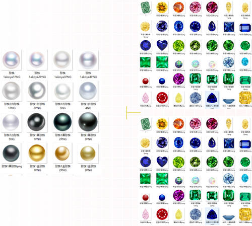 綠松石(不透明)、紅寶石(透明)、平片寶石、圓珍珠、異形珍珠、翡翠著色練習(xí);